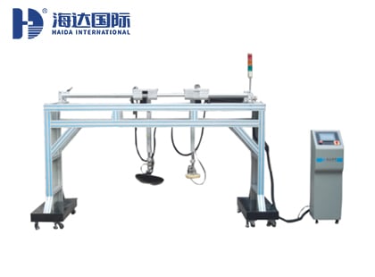 1、HD-F768-2床垫检测设备用一块底弧度300毫米,直径200毫米,半球体的加载块,反复对床垫施加1000N的压力,在指定的三个加载点各做10000次