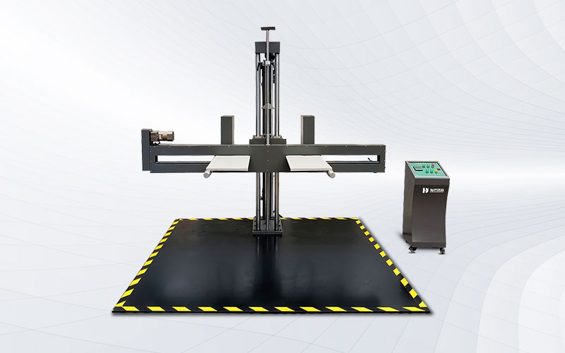 本机通过自由跌落的方式,对试件进行垂直冲击试验。试件可自由选择面、棱、二个状态进行跌落试验,跌落测试高度可提前预置。当试件升至预置高度后自动停止定位。可根据产品的不同大小尺寸进行选择测试托臂之间的距离,电动调宽。本试验机释放机构自由灵活可靠,确保试件在释放瞬间和自由跌落途中不受任何外力影响,从而确保了试件所要求的跌落状态。