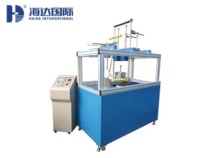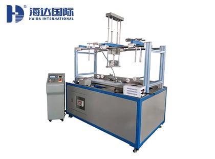 海达仪器HD-J222-1滑板车动态耐久性试验机,其目的是模拟滑板车,溜冰鞋路况运动时底轮及车体之动态耐用之程度(亦可用来作其它类产品之试验),为改善动态耐用性之质量提供可靠之依据。本机是通过磁粉制动器调节转速改变滚筒之转速来达到测试目的。
