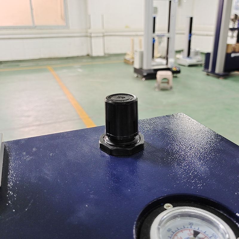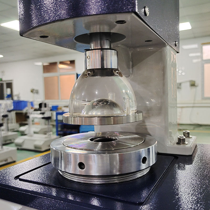 在仪器密封的油缸和压纸座的容腔内,装满甲基硅油作为压力传递的介质,当电机带动活塞匀速前进时,橡皮膜受到硅油的加压而突起,此时夹持在胶膜上方,被上下夹盘固定住的试样,均匀受力,直到试样破裂,处理芯片锁住最大压力值,通过液晶屏显示该压力值,此压力值即为本次试样的耐破度。